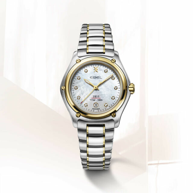 Dameshorloge EBEL 1911, kast van roestvrij staal en 18K geelgoud, Ø 30 mm, wijzerplaat van wit parelmoer met 10 diamanten (0,052 ct), datumvenster op 6:00 uur, saffierglas met antireflectiebehandeling aan de onderkant, tweekleurig roestvrij staal schakelarmband, vouwsluiting, Zwitsers quartz uurwerk, waterdicht tot 10 bar